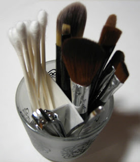 …make a brush holder for your mini brushes! I used cue cards, cut up and taped in carefully, in order to make three compartments: one for brushes, one for q-tips, and one for nail implements.