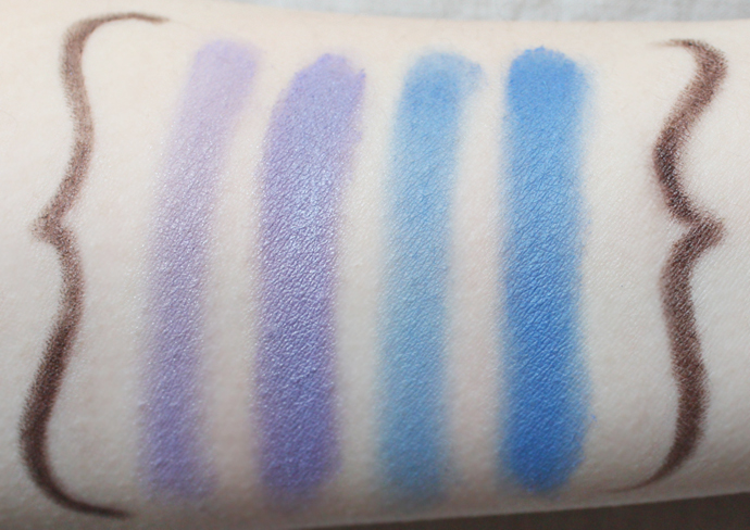 The shades: Royal Violet and Celestial Sapphire both have satin-matte finishes, another surprise! (Most drugstore shadows worth their salt in pigmentation get there by being soft and shimmery; while soft, these are far from shimmery). The violet swatches darker than I expected it to based on its colour in the pan, and the sapphire swatches a little lighter and more vividly than expected. Both, however, get a huge thumbs-up from me!